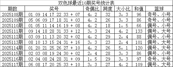 益达娱乐双色球第2025117期奖号为:06、08、17、20、25、33+10。其中红球和值为109,奇偶比为3:3,大小比为4:2,蓝球为偶数、大号。