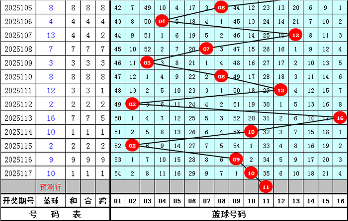 蓝球奇偶:近50期蓝球奇偶比为23:27,偶数蓝球出现较多,近10期蓝球奇偶比为3:7,偶数蓝球活跃,本期注意奇数蓝球03、09、11。