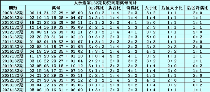 体彩大乐透第2025132期历史同期开奖号码分析: