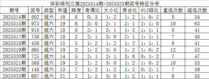 开奖公告:体彩排列三第2025323期开出奖号:687。组六,有重号:8,奇偶比1:2,大小比3:0,012比1:1:1,和值21,跨度2。