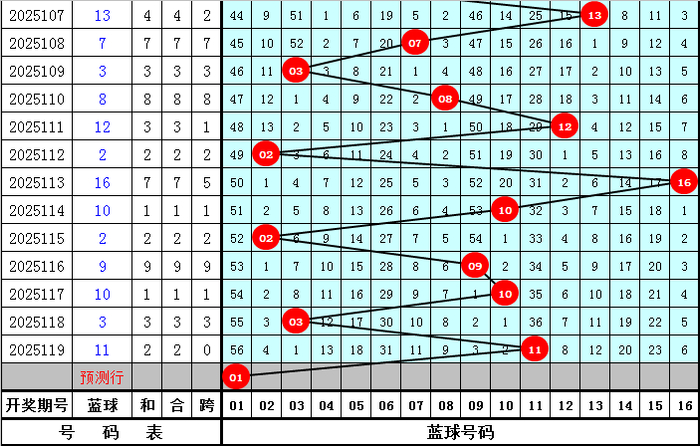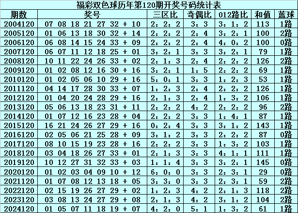 在第120期历史同期奖号中,红球三区分布总比例为50:33:43,奇偶总比例为61:65,012路比为47:42:37,和值分布在29-145之间,蓝球号码012路总比例为4:11:6。