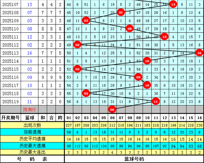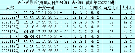 上期开奖:福彩双色球第2025119期奖号为:06 09 23 26 28 32 + 11,其中红球三区比为2:0:4,奇偶比为2:4,首尾间距为26,大小比为4:2。