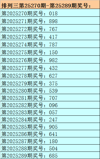 1.排列三最近十期分别开出号码:539-707-096-057-247-905-641-180-504-685,其中有7期奖号开出了上期的重复号码,本期预计第2025289期奖号:685中有重号,参考号码:6。