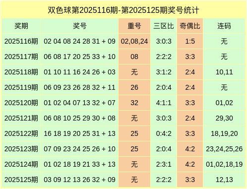 红球三区比为2:2:2,大小比为2:4,奇偶比为3:3,连码开出12,13,重复号码未出现。