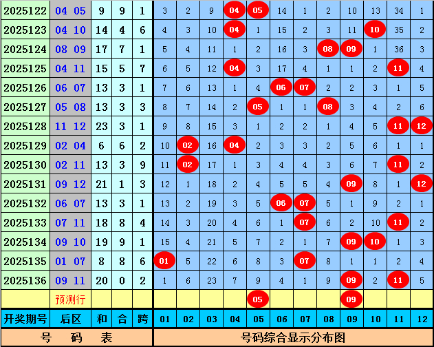 后区分析:在第137期历史同期开奖中,和值大小为8:8,跨度奇偶比为9:7,本期后区注意两码05和09。