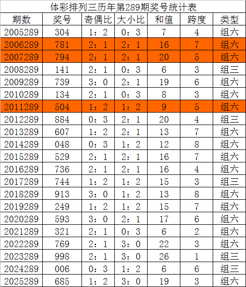 排列三第2025289期奖号为685,奇偶比为1:2,大小比为3:0,和值为19,跨度为3。
