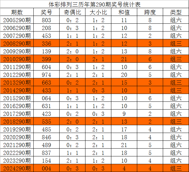 体彩排列三历年第290期开出奖号分别为:803、208、453、336、139、399、604、974、663、433、064、631、423、535、485、846、489、837、154、004。统计详见下表: