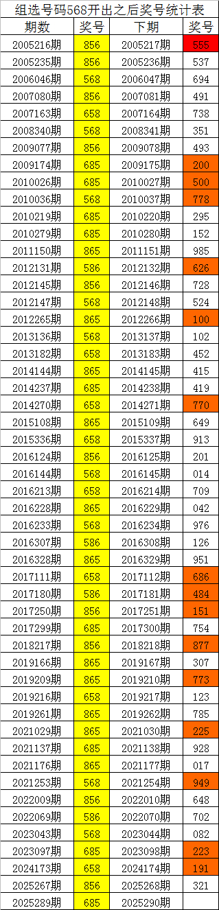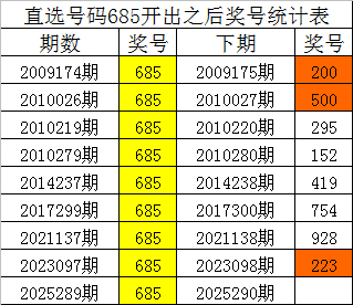 从上表统计可以看出,直选号码685开出之后,其下期奖号: