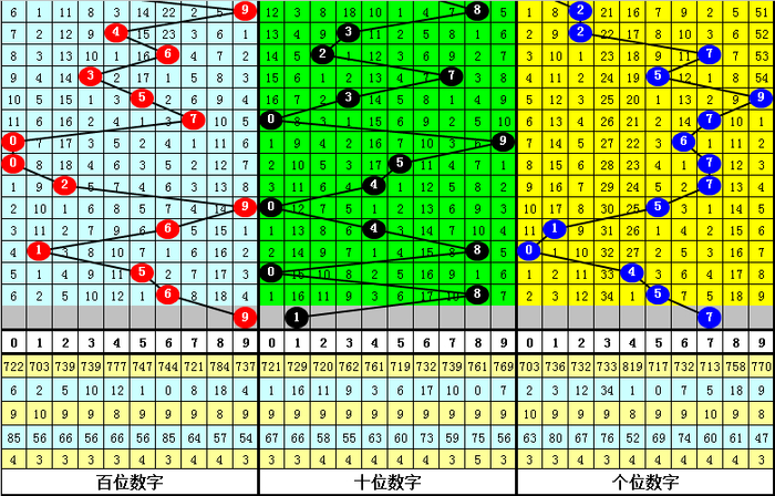百位号码奇偶比为4:4,奇偶号码出现比例相当,本期防止开出奇数号码;大小比为3:5,大号走势较冷,本期预计开出大号。