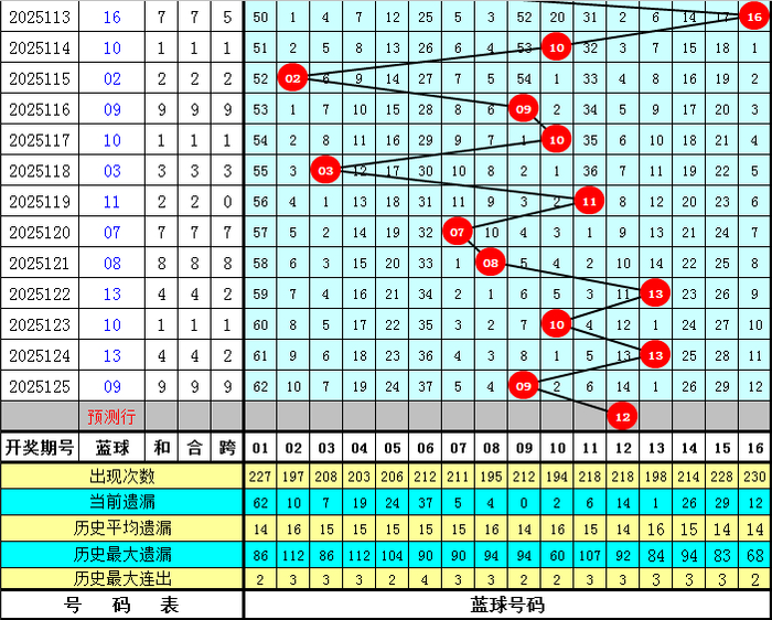 蓝球号码分析:上期蓝球为09,开出0路号码,蓝球最近10期012路比为3:5:2,最近30期012路比为6:14:10,最近100期012路比为29:39:32,本期蓝球看好0路号码,四码蓝球参考03、06、09、12。