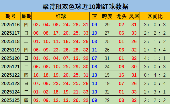 区间比分析:红一区(1-11)红二区(12-22)红三区(23-33),上期开出区间比2:2:2,近10期区间比为23:13:24,1区出号较温,2区出号较冷,3区出号较热,综合分析,本期预测各区出号均衡,开出区间比2:2:2。