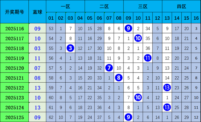 蓝球四区分析:上期蓝球号码09为大奇数号码,近10期大小总比为7:3,大码蓝球出号较热;10期内出现在四区比为1:2:5:2,3区出号较热;预测本期蓝球号码会出现在2区,独蓝推荐05。