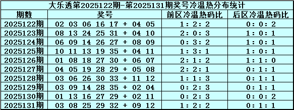体彩大乐透第25131期奖号为:03 08 25 29 32+09 12,前区奖号奇偶比为3:2,012路比为1:1:3,大小比为3:2,遗漏总值为39,后区号码遗漏总值为8。