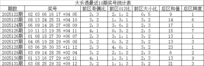综合分析超凡国际平台,大乐透第25132期前区012路比参考2:1:2。