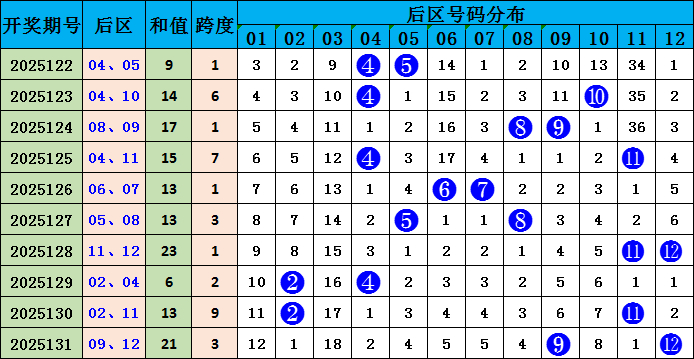 后区分析:上期后区开出号码09、12,为大大奇奇组合。