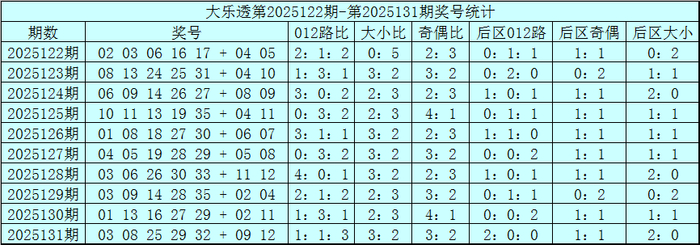 体彩大乐透第25131期奖号为:03 08 25 29 32+09 12,前区奖号012路比为1:1:3,奇偶比为3:2,大小比为3:2,后区为全0路号码。