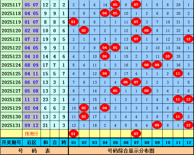 后区分析:上期后区开出全0路号码09和12,最近30期后区奖号012路比为16:19:25,最近10期后区奖号012路比为5:6:9,本期后区注意号码01、02、06、07、11,单挑两码组合01、07。