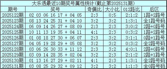 亿万28大乐透第2025131期开奖号码:03 08 25 29 32 + 09 12。前区奖号大小比为3:2,奇偶比为3:2,012路比为1:1:3,后区为全0路号码。